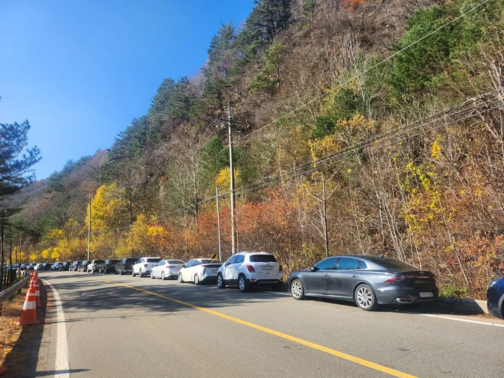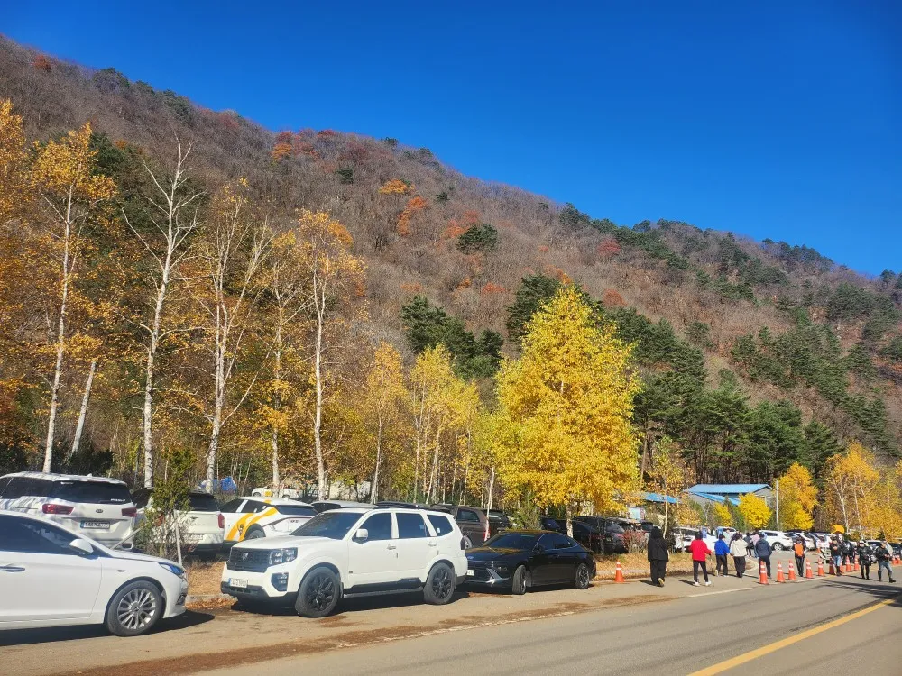은행나무숲 전용주차장이 마련되어 있었지만 노란 은행나무를 보고 싶어 하는 방문객이 많다 보니 주차 공간이 부족해서 갓길에 주차하고 걸어서 은행나무숲에 갔어요.